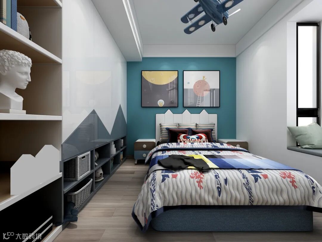 The boy's room adds blue elements to the white foundation, which is full of vitality. With plaster statues and aircraft projection lights, children can feel the breath of art and imagination and grow up healthily.