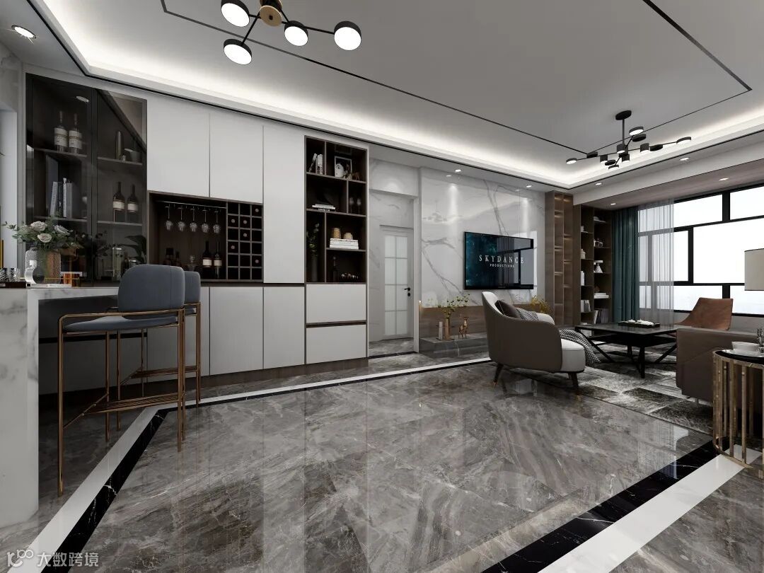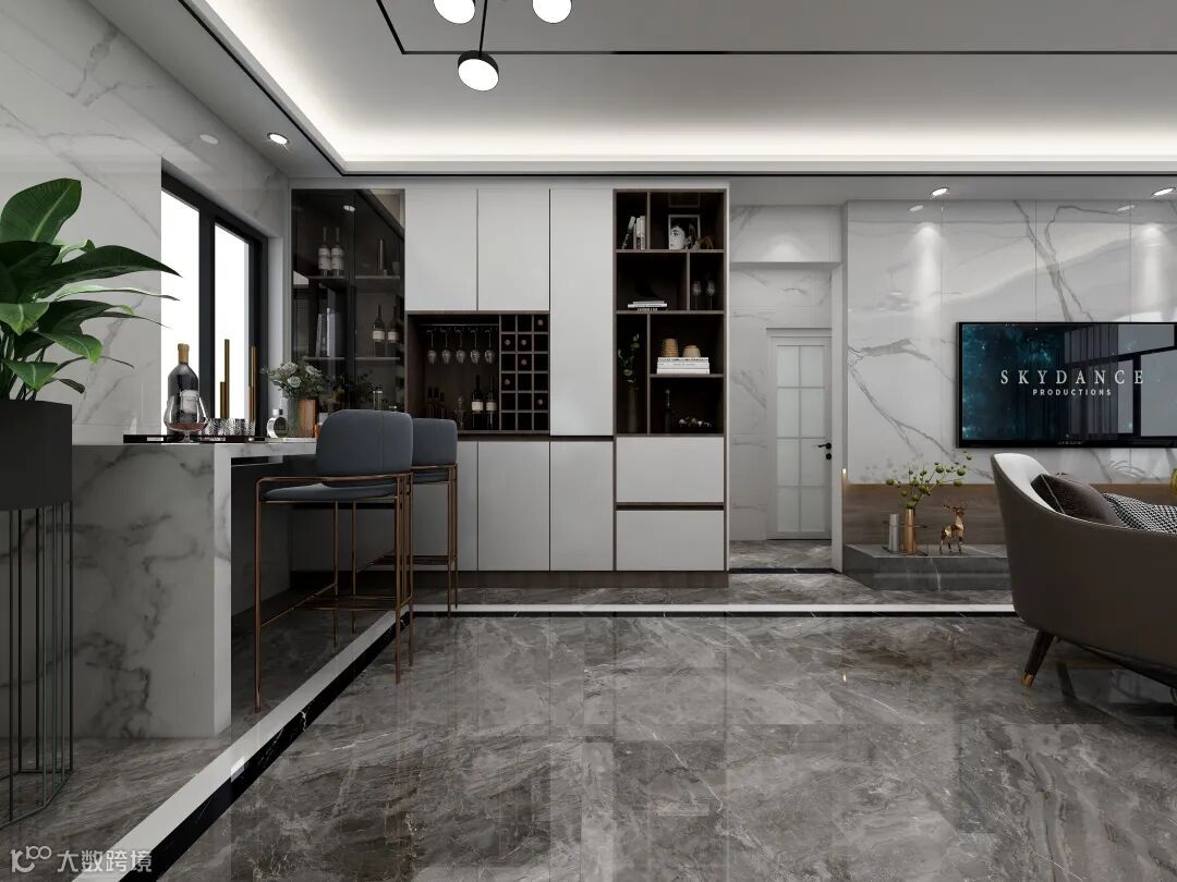 The living room has a modern space and a stylish and advanced texture. The floor is polished gray and white floor tiles, with brown chairs, presenting a modern and dignified sense of luxury. The extended space, marble countertops, and milky white wine cabinets create a low-key romantic bar atmosphere. The legs of the chair are in the shape of a metal triangle bracket, which echoes the round table in the restaurant, which is full of luxury.