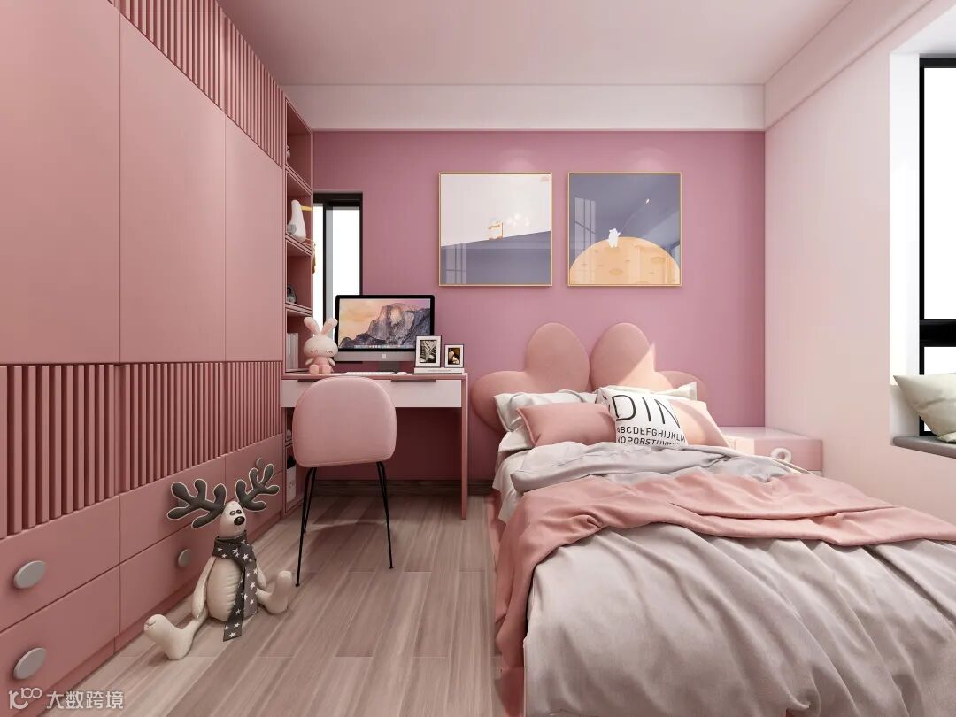The wardrobe and desk in the girl's room are integrated, making full use of the space, and the fence-like design increases the sense of lines and interest in the space, without being dull and monotonous. On the basis of the overall pink tone, warm and clean milky white colors and simple pen paintings are incorporated to increase the space color block and show more layers.