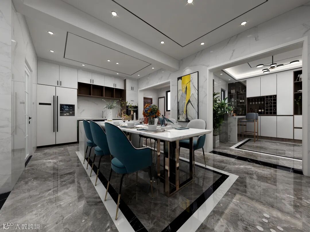 The overall design is without the main light, and several sets of downlights are installed in the ceiling to bring a minimalist and generous space. The white marble dining table and leather art blue metal frame dining chairs are arranged in the dining room, revealing a sense of high-end elegance and modernity. The tableware and decorations carefully placed on the dining table, and the artistic abstract paintings on the wall also add a bit of exquisite dining experience to the space.