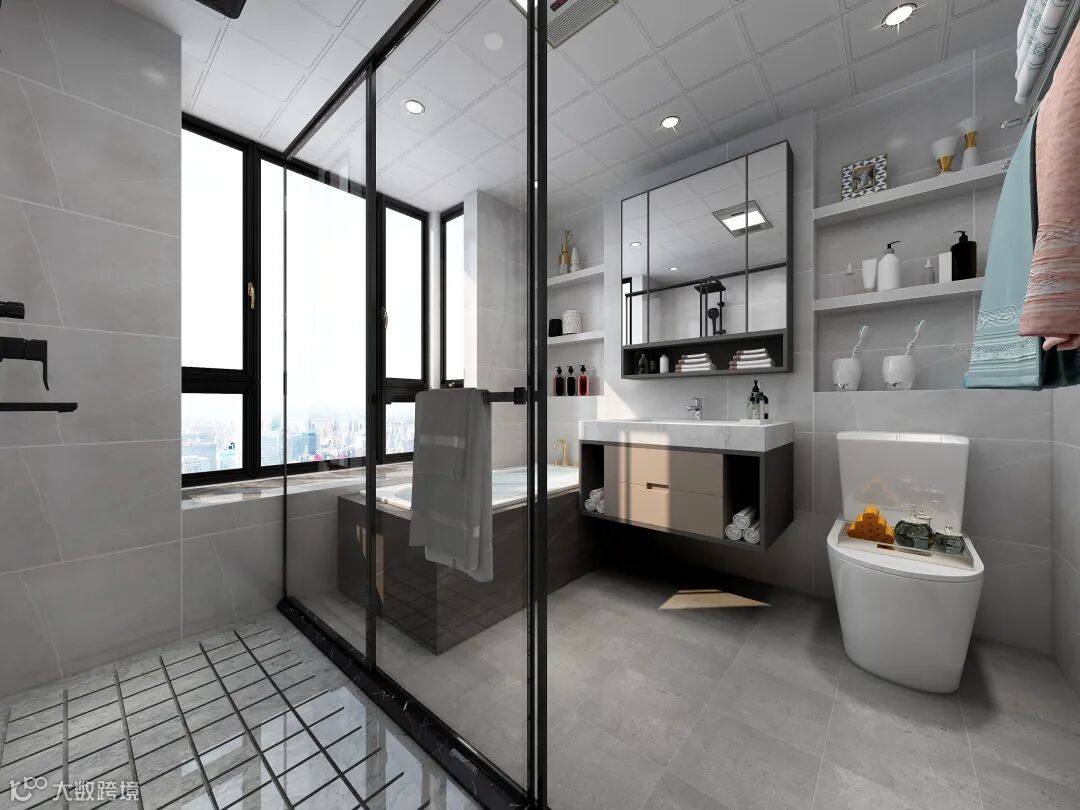 主卫|主卫的黑框玻璃划分功能区,同时用壁龛代替传统置物柜,不仅防湿防潮使用方便,装饰性也极佳。浴缸伴随着透光不透明的光线,整个洗浴氛围也变得有情调了起来。