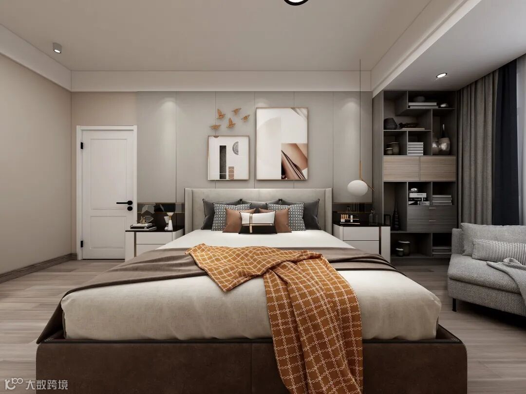 The comfortable and elegant beige gray can relax the body and mind as soon as the door is opened. The bedroom is based on a rectangular panel bedside wall, and the side cabinet is an open design with drawers, and a soft fabric sofa is placed, bringing a quiet, elegant and practical bedroom space.