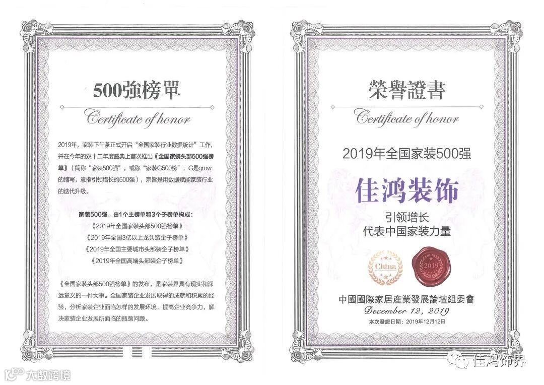 2019年12月,荣获2019年全国家装头部500强,引领增长,代表中国家装力量。