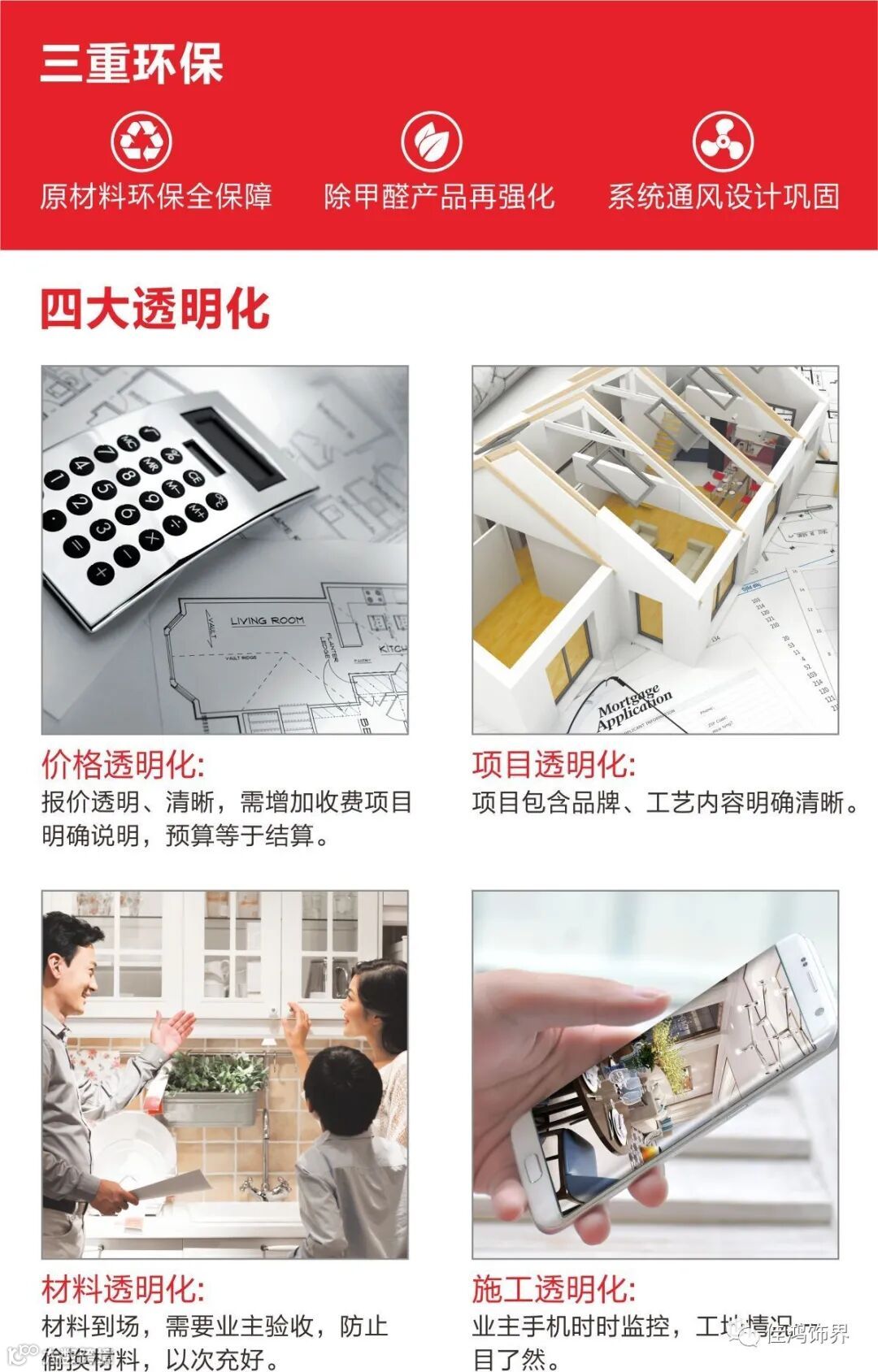 作为全国最先倡导环保透明家装的品牌。我们一直以来都以“3重环保、4项透明”作为我们的环保体系。在环保上坚持“原材料环保全保障、除甲醛产品再强化、系统通风设计巩固”;在体系上我们承诺做到“0增项,价格透明化;明品牌,项目透明化;提前选,材料透明化;可视化,施工透明化”。