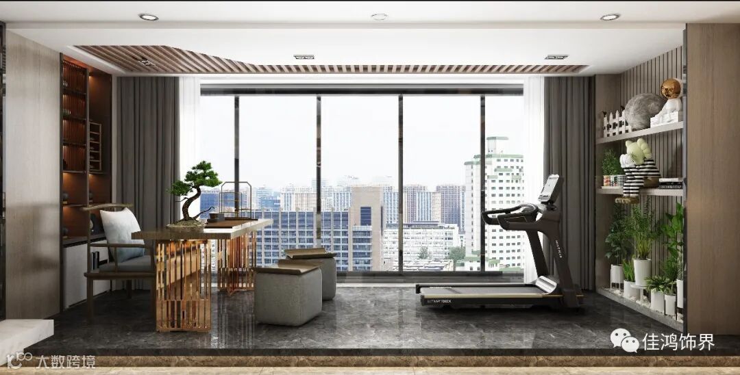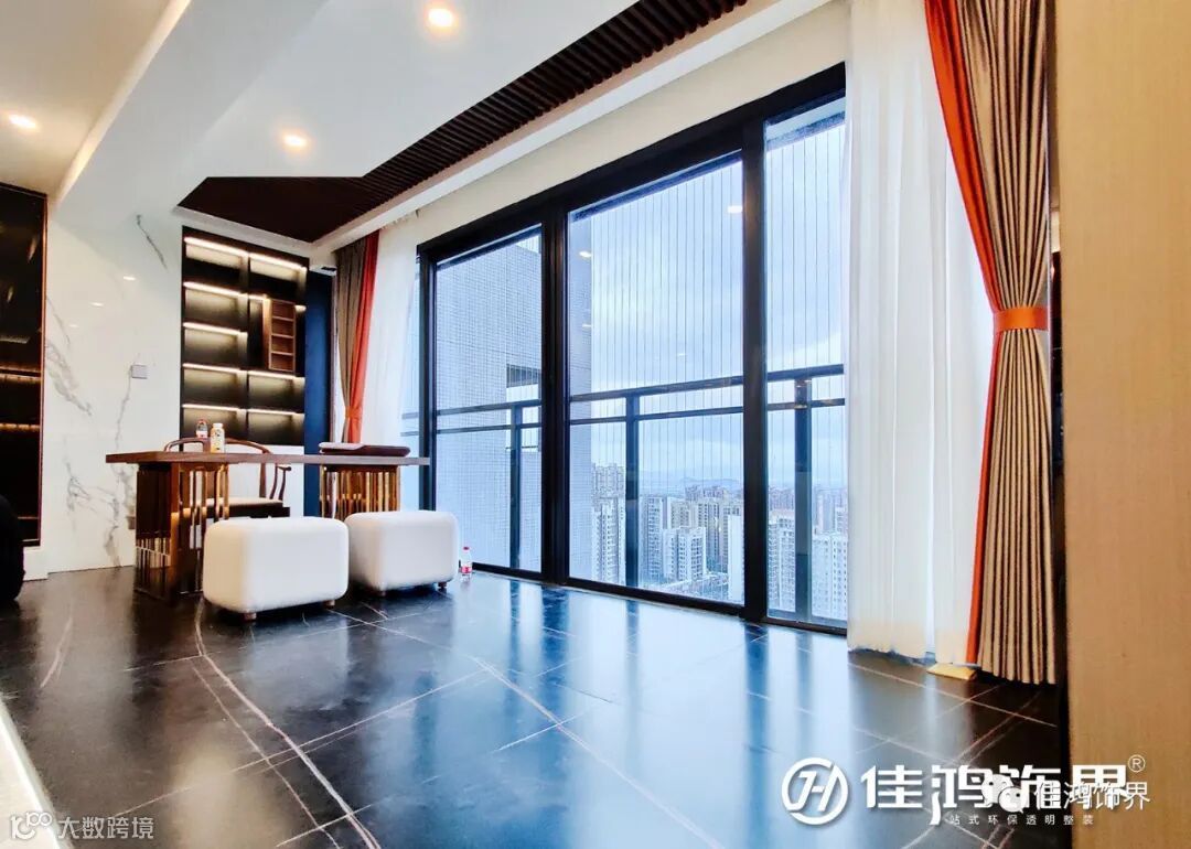 ▲ 阳台地砖采用了较深的黑灰色,与客厅进行了隔断也增添了时尚感!摒弃了传统的布局,把阳台封闭起来做成了休闲区,全景的落地窗采光很足再放上一个茶台,可以约上好友一起喝茶聊天。
