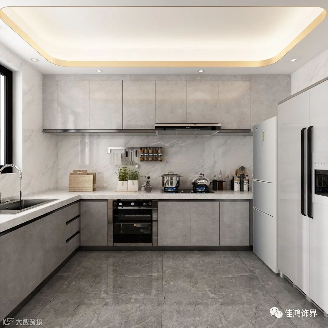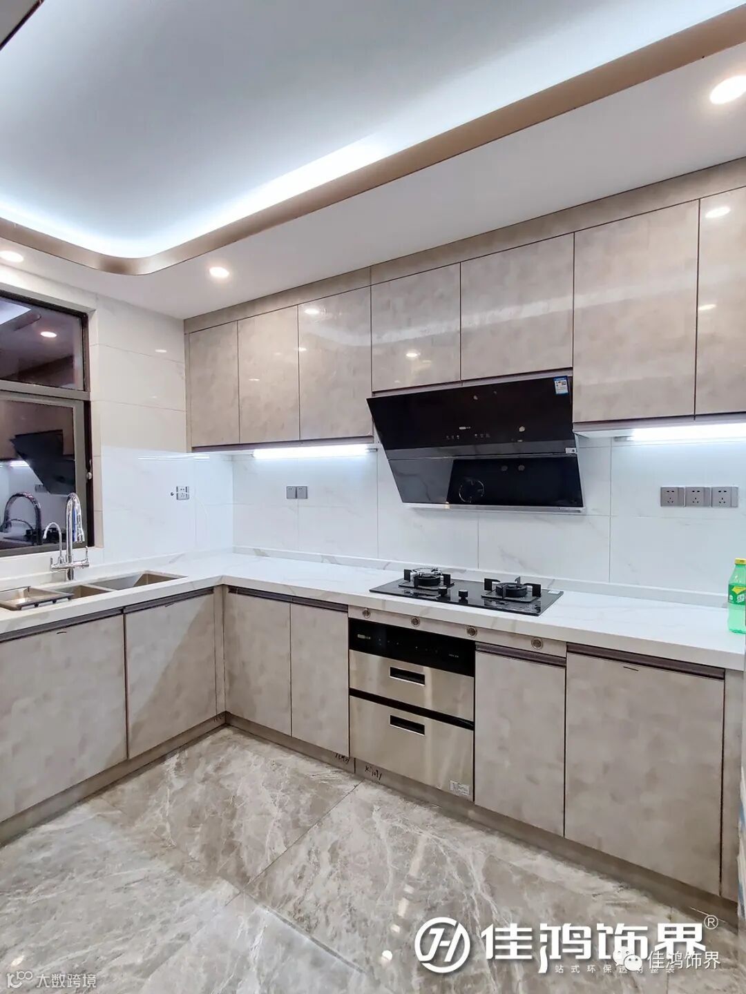▲ 厨房格局方正较大,U型布局高效又省力,一个L型的操作台,可以容纳多人同时使用,提高做饭效率,冰箱放在清洗区的对面,让厨房空间最大化利用。定制橱柜完美契合空间,柜门采用无把手设计,整洁美观。