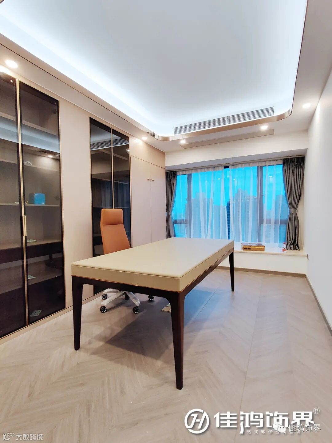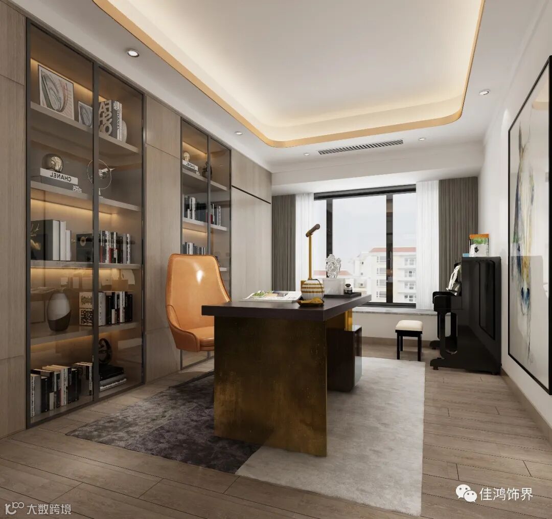 ▲ 为营造氛围,书房选用了木地板,整体色调还是沿用客厅的搭配,办公桌后面是带玻璃门的书柜,方便打扫卫生同时也能很清晰的找到书籍,工作学习累了还能在飘窗处稍作歇息。