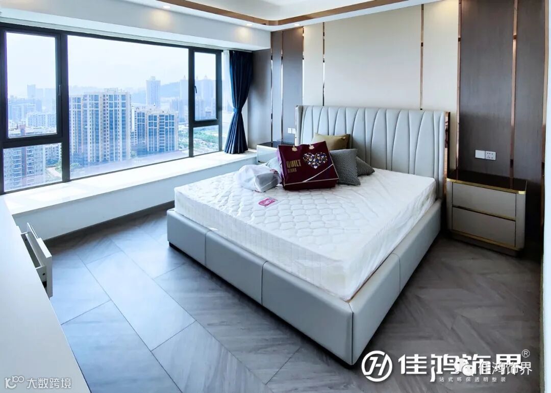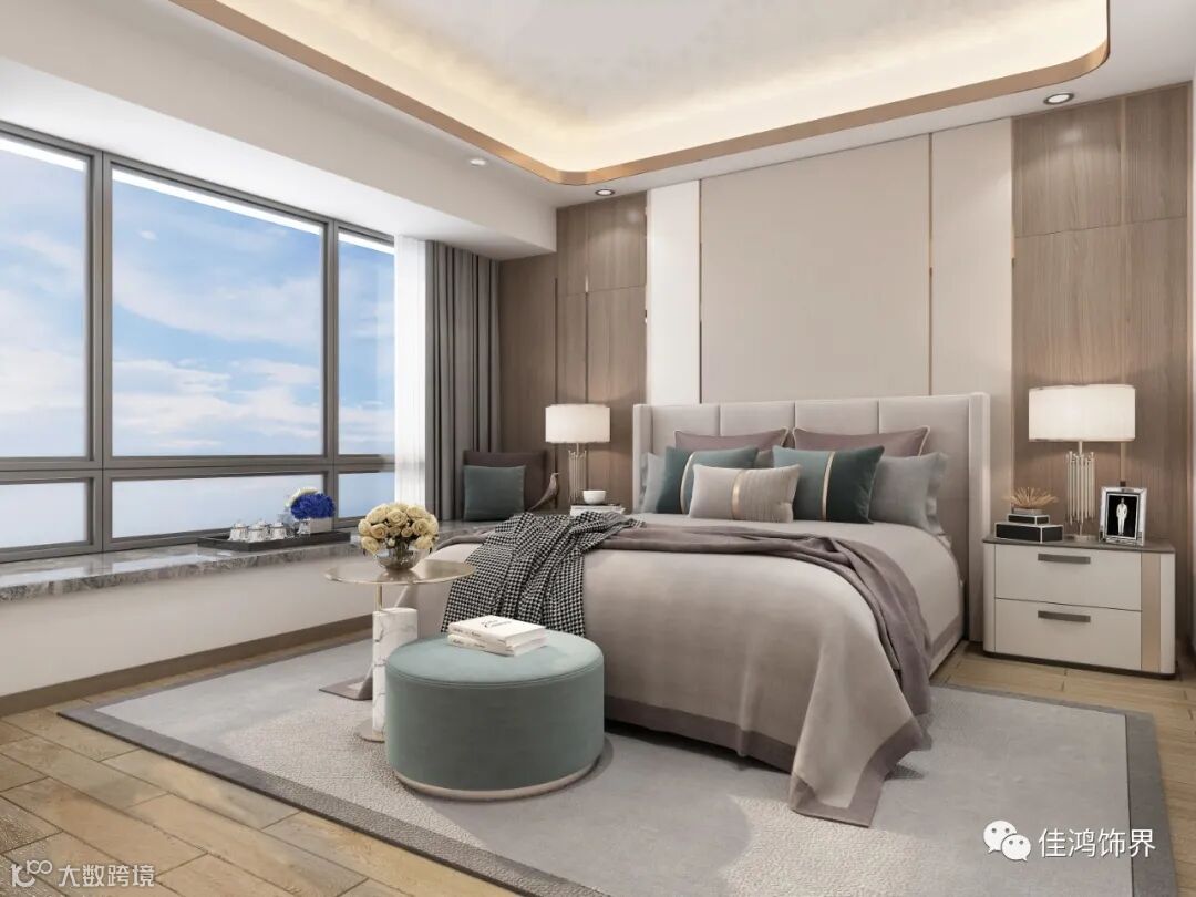 ▲卧室也选择了木地板,高靠背软包床头,靠着柔软舒适。撞色木质背景墙以金属线条装饰,精致满分;两边都放置了床头柜和插座,还有一个长桌方便放置物品。一个全景窗台飘窗很惬意。