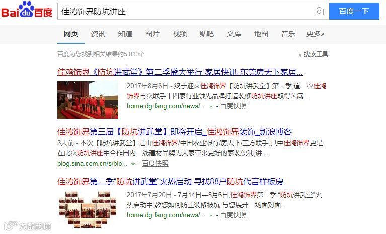 百度搜索“佳鸿饰界防坑讲武堂”,截止目前可以看到我们一共举行了两届家装防坑讲座,都取得非常大的成功,不少媒体都对此进行了报道!讲座主要以揭秘行业不规范,教会大家如何避免装修会遇到的“坑”等!为广大业主解决了不少装修难题。