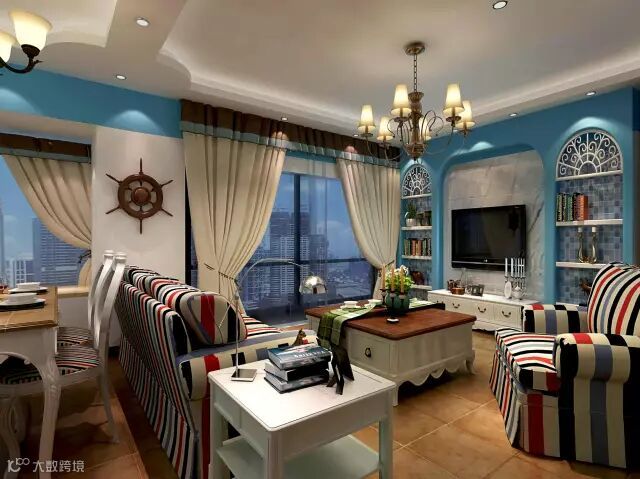 电视背景墙可以奠定整个家的主题基调。设计师设计上非常巧妙,费用不多但一样精巧别致。马蹄形窗户做修饰,再刷上蔚蓝色的基底色,尽享海洋的浪漫情怀,舒适的布艺家具,点缀一点装饰道具,给人一种宁静的享受。