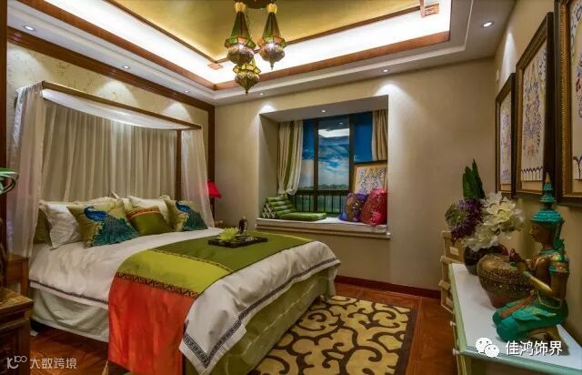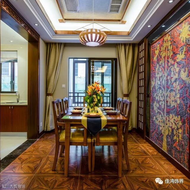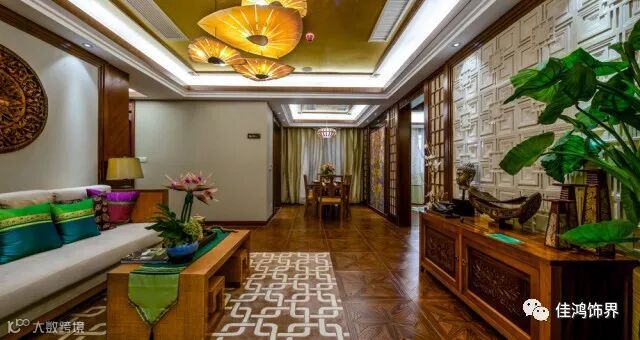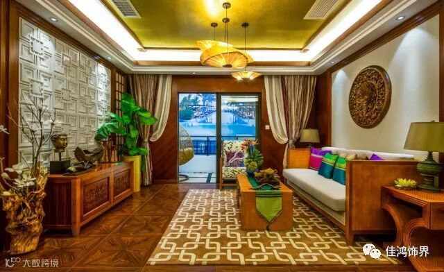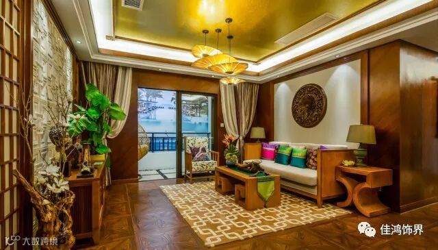 东南亚风格广泛地运用木材和其他的天然原材料,如藤条、竹子、石材、青铜和黄铜,深木色的家具,局部采用一些金色的壁纸、丝绸质感的布料,灯光的变化体现了稳重及豪华感。