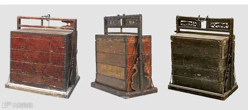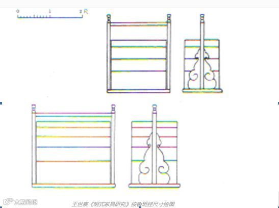 《鲁班经》匠家镜中如是说:大方杠箱样式柱高二尺八寸,四层。下一层高八寸,二层高五寸,三层高三寸七分,四层高三寸三分,盖高二寸,空一寸五分,梁一寸五分;上净瓶头共五寸,方层板片四分半厚;内子口三分厚,八分大;两根将军柱,一寸五分大,一寸二分厚;奖腿四只,每只一尺九寸五分高,四寸大;每层二尺六寸五分长,一尺六寸阔,下车脚二寸二分大,一寸二分厚,合角斗进雕虎爪双钩。