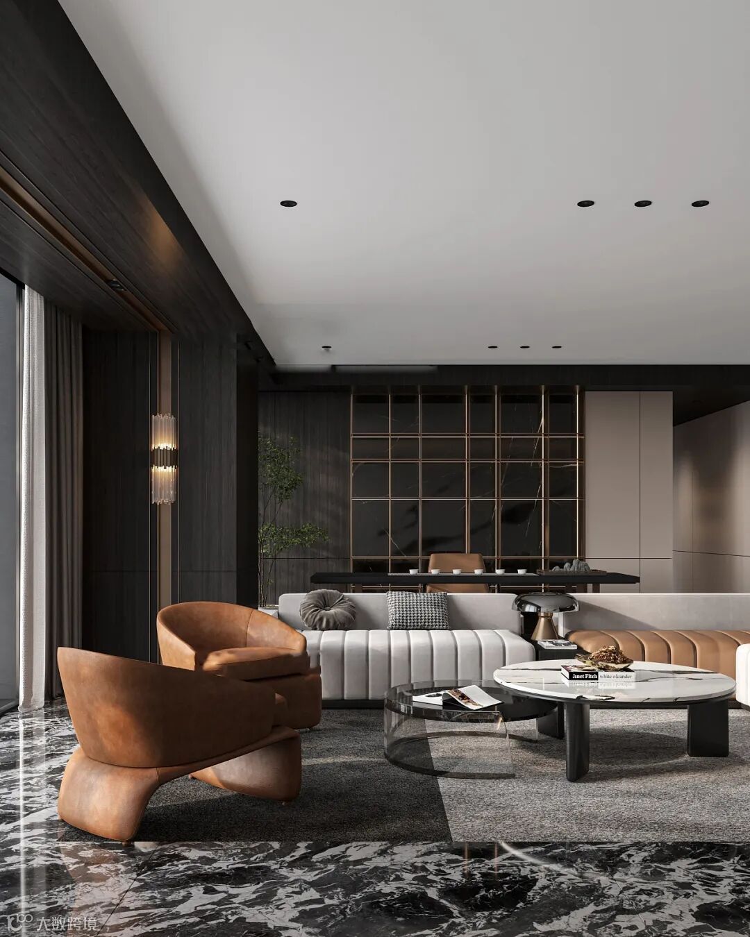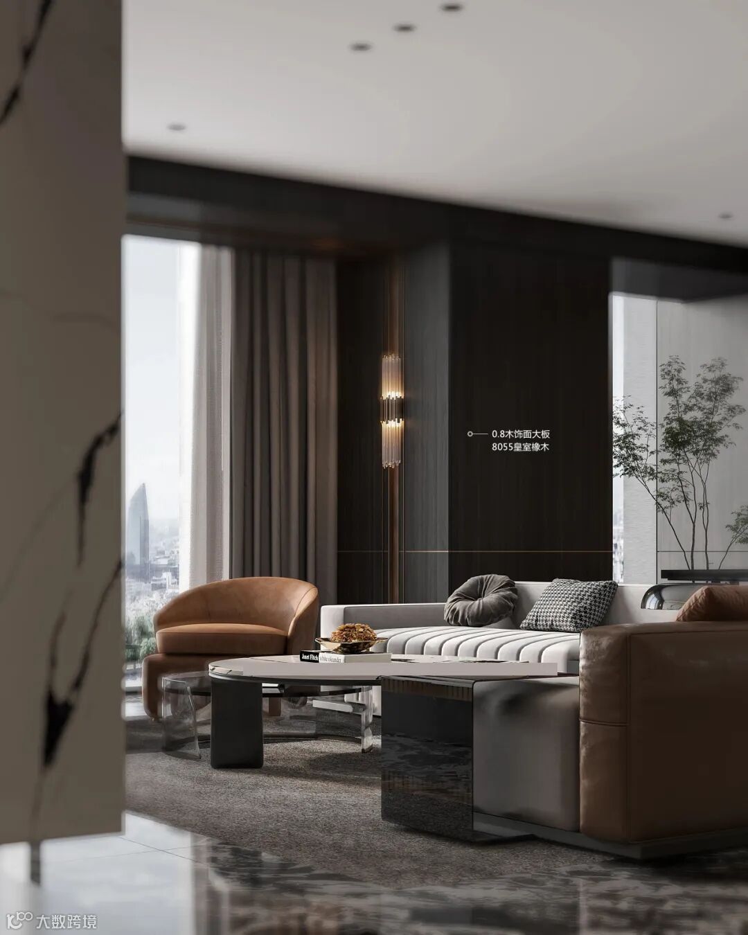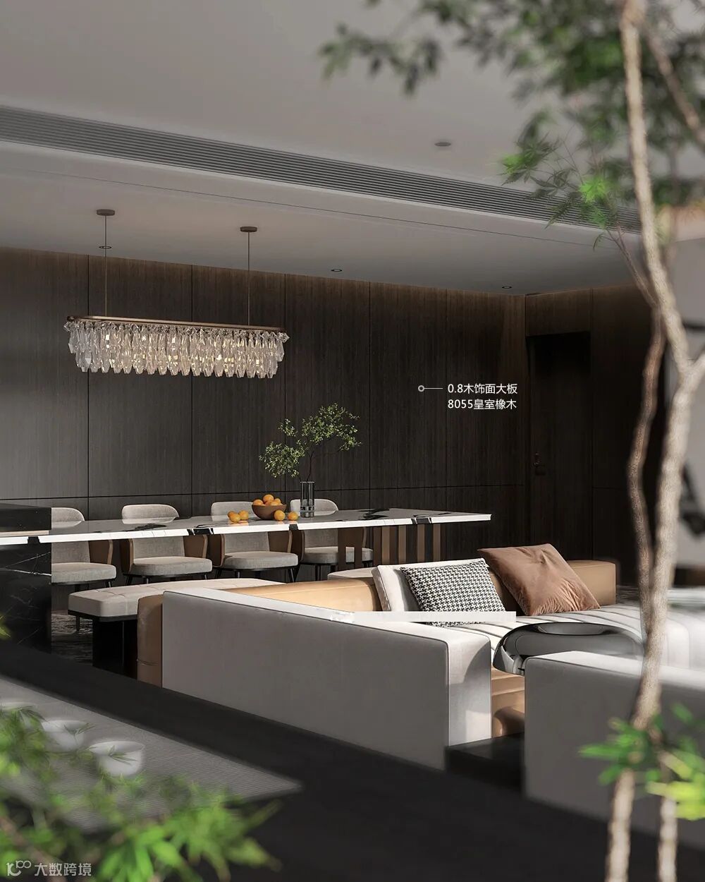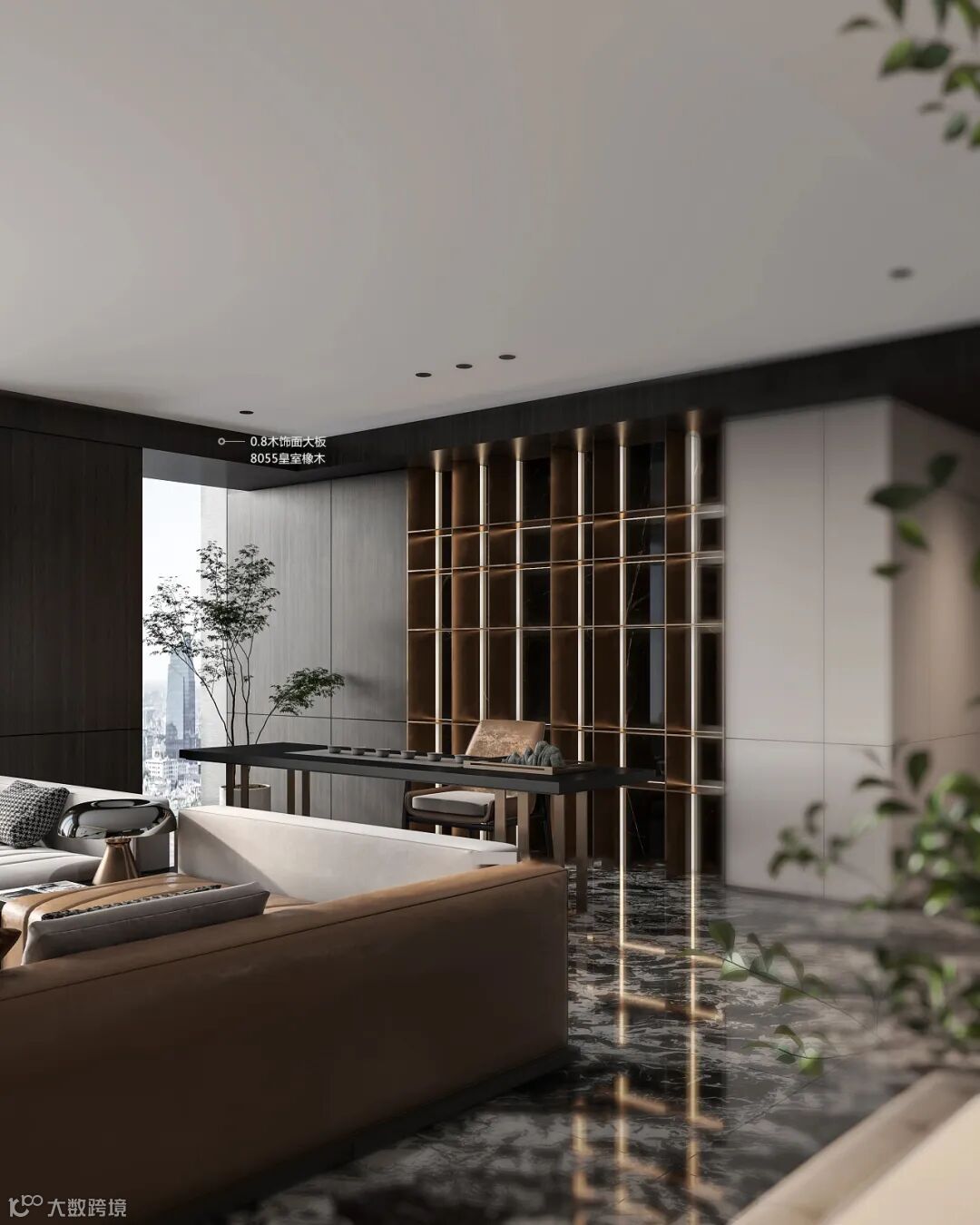 休闲区的墙面以8055皇室橡木木饰面的空间为主,布置绿植摆饰,搭配现代简洁的灰棕拼接沙发,营造出优雅高档的大气感。橡木木饰面营造出一种简约自然的空间感,让人住在这个空间,感受着惬意舒适的从容体验。