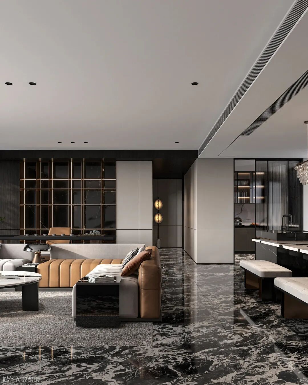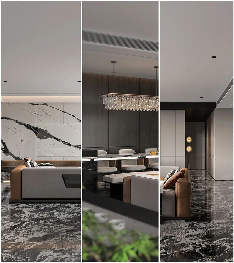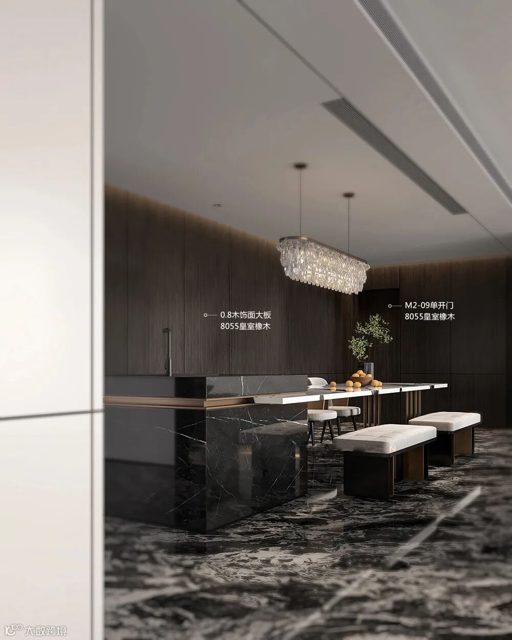 餐厅背景墙是8055皇室橡木纹理的木饰面墙面设计,搭配黑白的大理石餐桌,搭配实木+布艺坐垫靠背的餐椅,营造出一种现代时尚的高级空间感。