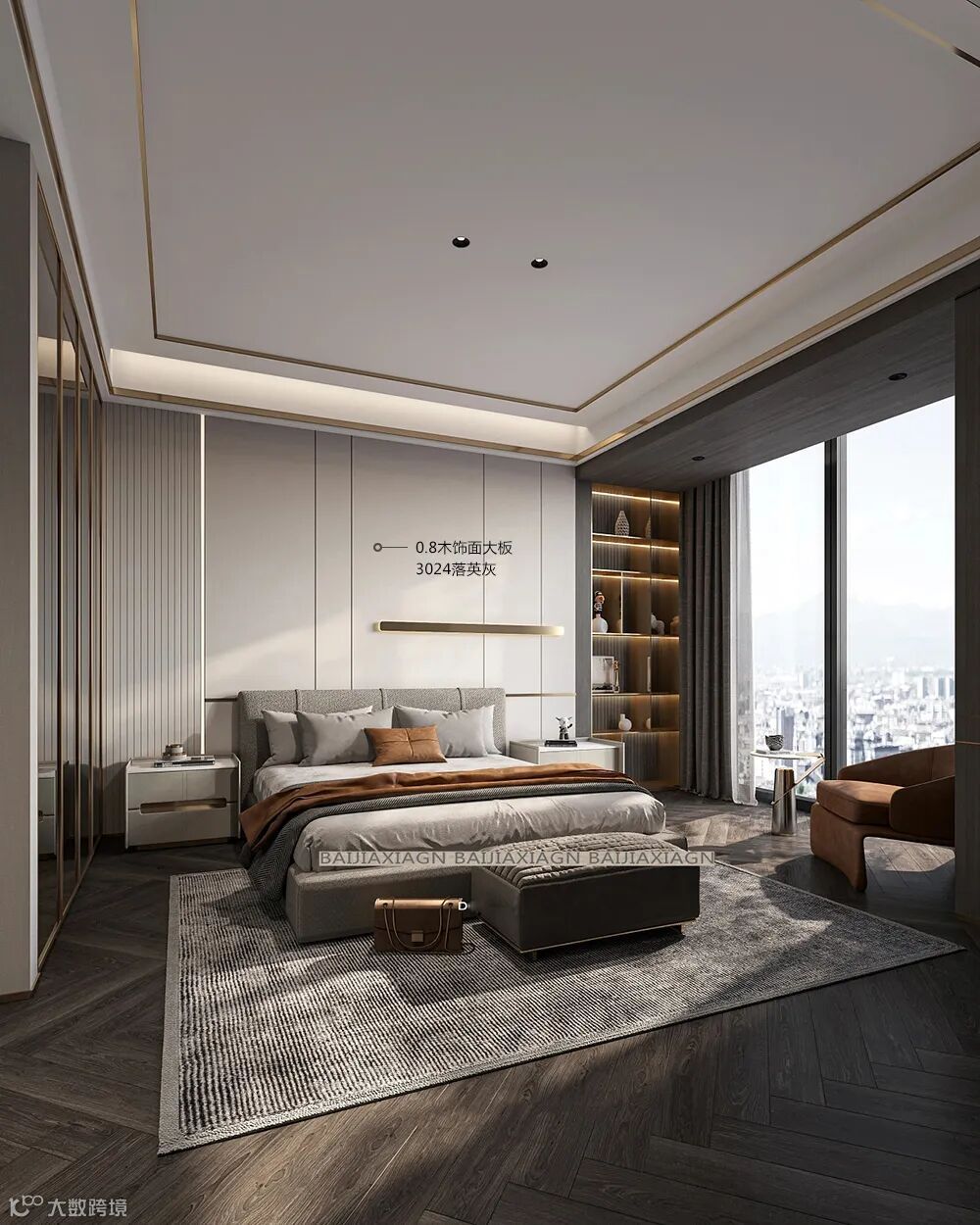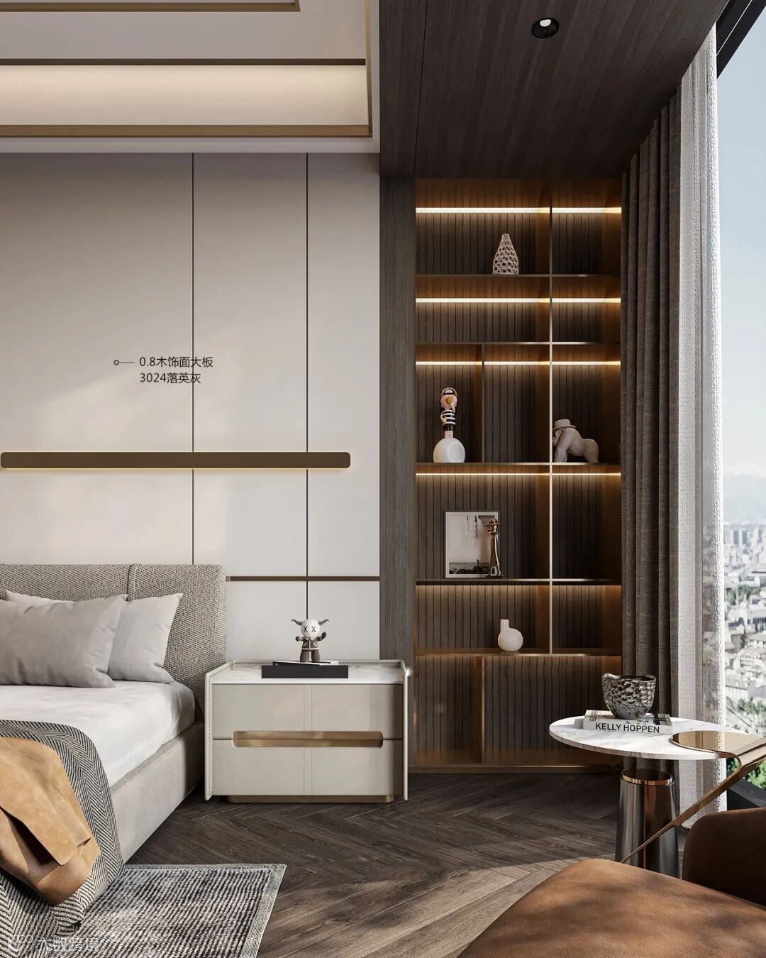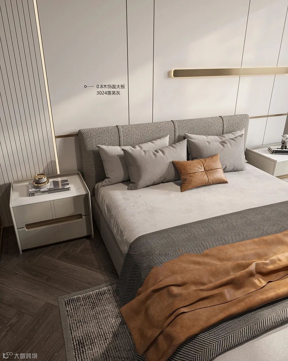 卧室床头背景墙,背景墙选择大面积的3024落英灰木饰面,营造温馨优雅的氛围,搭配金色的简约金属线条,进行视觉层次感上的丰富。