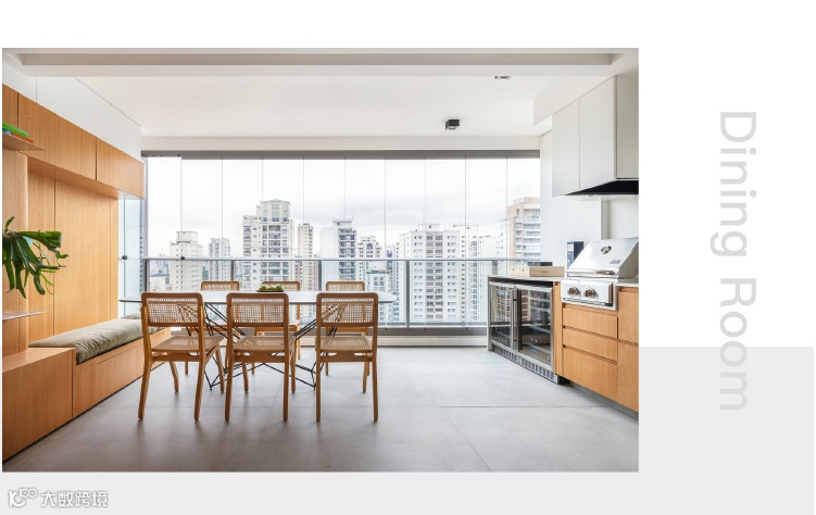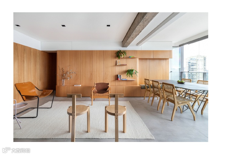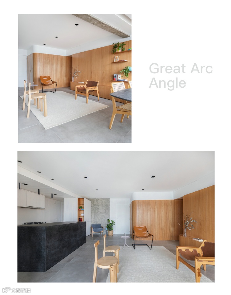 客厅设计非常有特点,整体用木饰面来处理,并且运用了阳角的弧形元素。不仅带来了极致的优雅,又让木饰面的纹理展现得十分自然、细腻。同时,在色彩过度上也秉持的灰、原木、白的基调,看起来既温润又很有氛围感。客厅和餐厅随着中厅相连,形成一个大而开放的空间,身处其中也觉得南北对流畅快舒适。