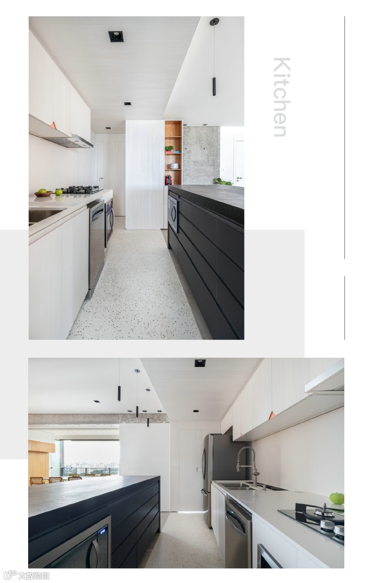 开放式厨房素雅黑白灰相间,是打造简约家居永恒的主旋律。白色厨房吊柜彰显着现代简约中的高级气质,纯净明快的面板让整个厨房空间,自带光环,立显宁静雅致的大气范儿。定制的餐边柜,上柜无门式且用了跳色做柜体,下柜则可完整收藏零碎杂物。宽敞的置物台面,招待亲友时便于准备咖啡、茶点,水果。