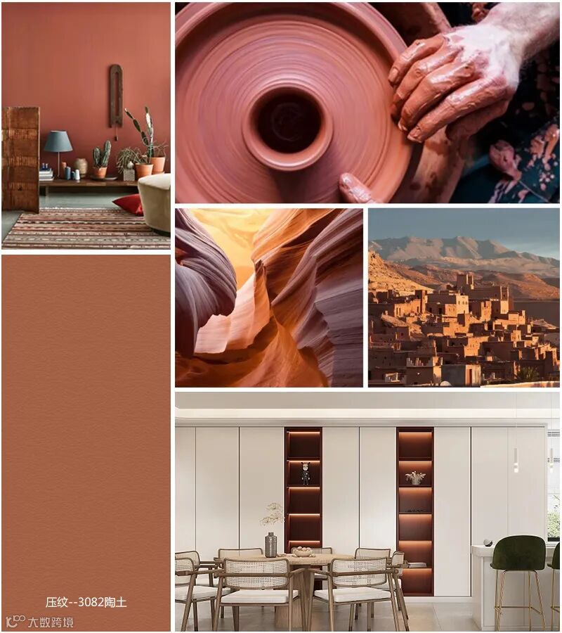 陶土色是带有棕色阴影的红色调,就像烧焦的粘土和砖块的颜色,代表着生机与希望的陶土色,是植物陶盆的原色。它让人联想起美丽风景和丰饶土地,它的身上萦绕着的清新文艺的魅力气质和复古气息,自然而理性。3082陶土亮度柔和,这种基调可以让任何室内空间变得具有活力和温暖。