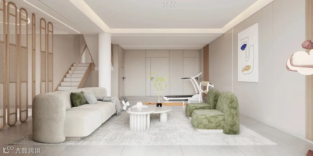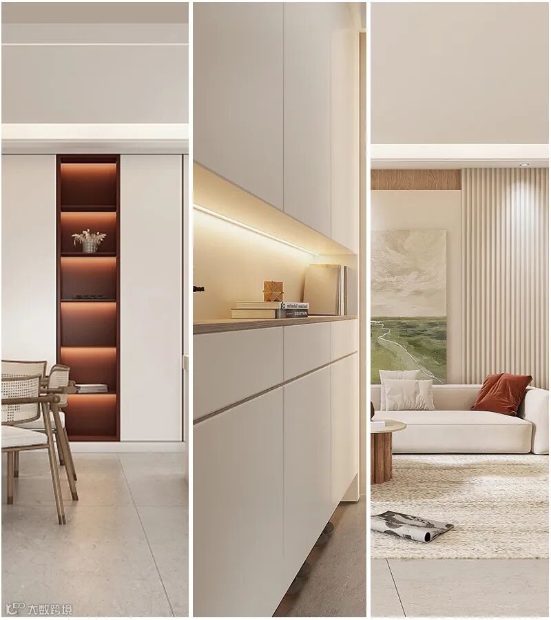 进门遇见冰川白的鞋柜,加上迎面的格栅墙,家被轻柔的奶油色拥抱,浅淡的色彩仿佛如风一般轻盈,徜徉在每一个角落,像是午后的阳光,柔软似乎触手可及。