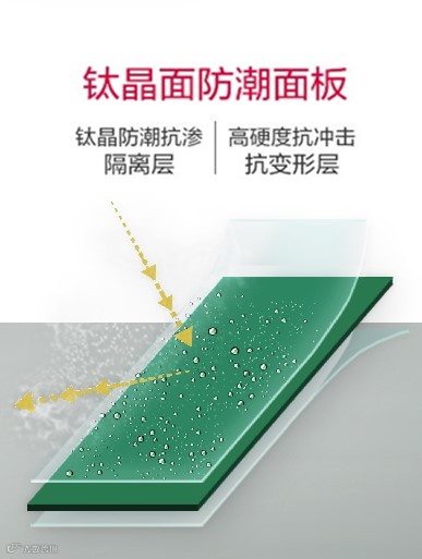 采用的是国内环保等级最高的P2(美国认证)级别的钛晶板做面板。中间为实木龙骨,四面采用ABS封边,线条采用CPL材质进行包覆,整体环保等级接近E0,并具有防水不吸潮、耐磨、阻燃、隔音等优势。
