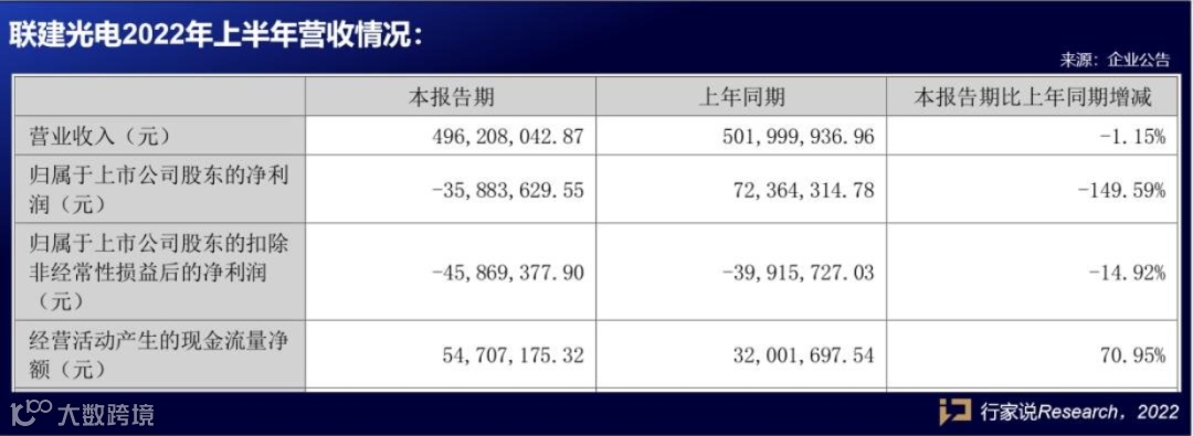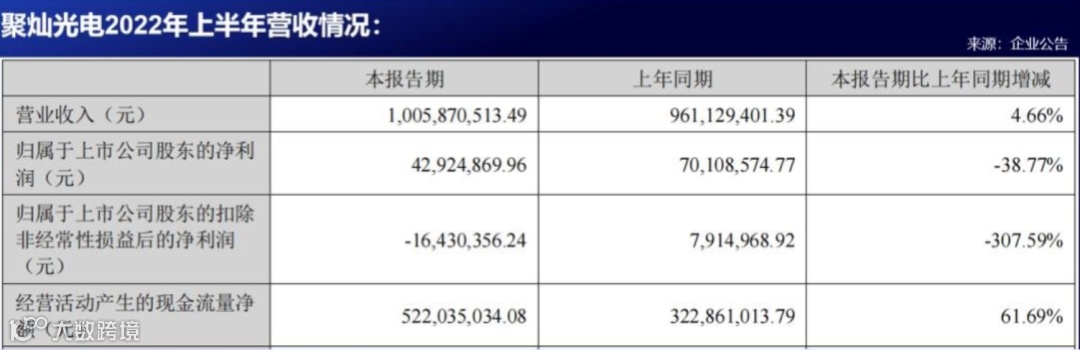 8月29日晚间,聚灿光电对外披露2022年半年报,报告显示公司实现营业收入约为10.06亿元,同比增长4.66%;对应实现归属净利润约为4292.49万元,同比下降38.77%;