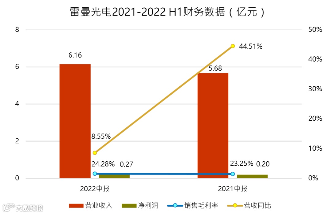 2022年上半年,雷曼光电实现营收6.16亿元,较上年同期增长8.55%;归母净利润2744.77万元,较上年同期增长34.56%;公司海外显示及照明业务均显着增长,实现海外业务收入4.49亿元,同比增长40.61%;在国内市场,上半年实现收入1.67亿元。
