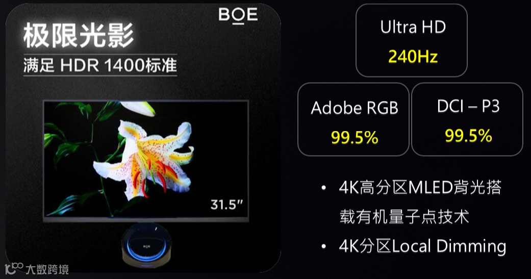 据悉,其4000 分区 Mini LED 技术是与有机量子点技术配合,在31.5英寸显示器上实现了 HDR1400 亮度、 99.5% DCI-P3 色域和 Adobe RGB 色域。