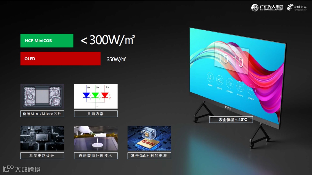 最新推出的HCP MiniCOB C2系列产品,通过自研倒装Mini/Micro芯片、共阴驱动、体感冷屏技术、GaN材料电源、科学电路设计等一系列技术创新,成功实现了超高的能量转化效率,在600Nit亮度下平均功耗低至300W/m²,同时屏幕温度低于40℃,已经提前满足了相关标准的要求。这不仅意味着能为客户提供在节能方面更有竞争力的显示产品,也体现了中麒在Mini & Micro LED产业化道路上,对于实现绿色高质量发展的决心。