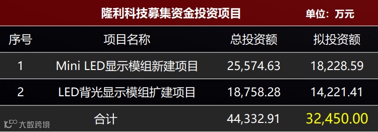 隆利科技:12月10日发布公告称,审议通过了《关于继续使用部分可转换公司债券闲置募集资金暂时补充流动资金的议案》,公司拟使用不超过人民币5,000万元的闲置募集资金暂时补充流动资金;经深圳证券交易所同意,公司已向不特定对象发行了324.5万张可转换公司债券,募集资金总额为3.25亿元人民币,其中1.8亿元用于Mini LED显示模组新建项目、1.4亿元LED背光显示模组扩建项目。