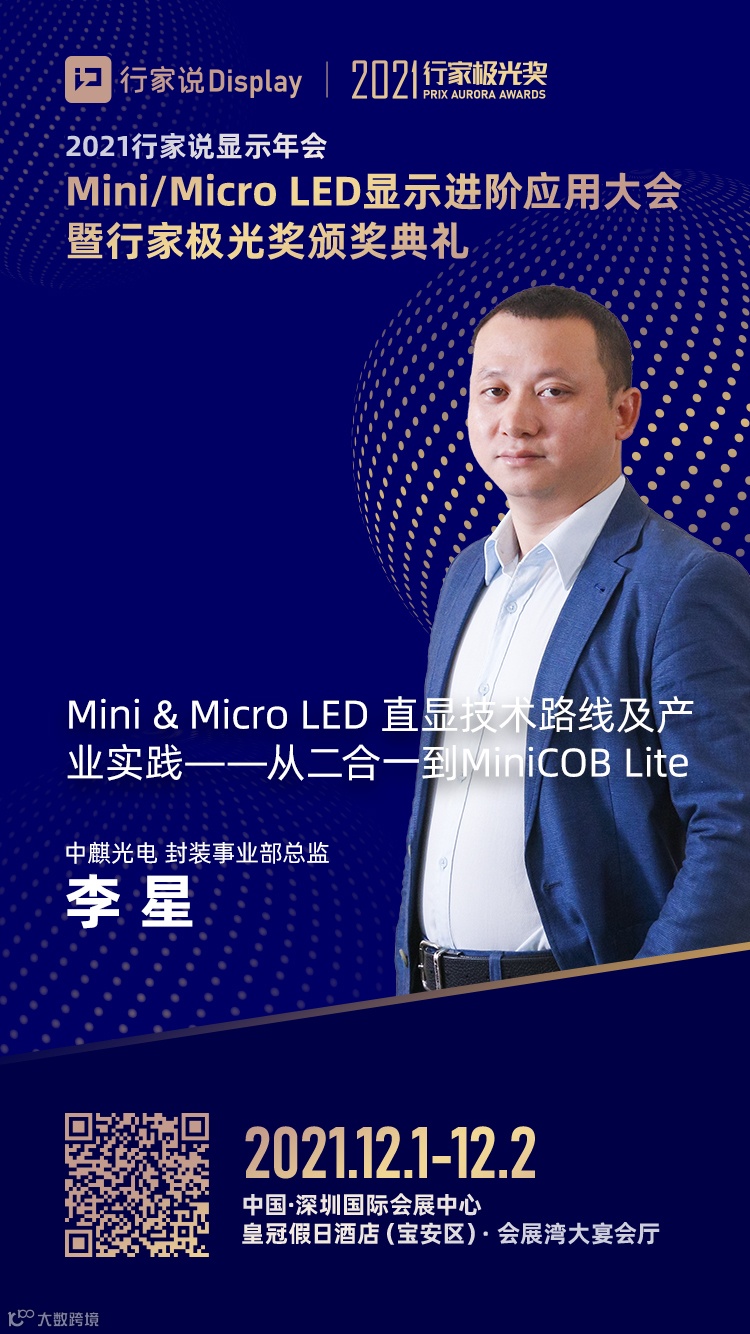 为了探讨在微间距发展之下,各技术路线发展的可能性,12月1-2日,行家说年会即将举办,东莞市中麒光电技术有限公司封装事业部总监李星将出席“Mini /Micro LED显示进阶应用大会”,并带来『Mini&Micro LED直显技术路线及产业实践——从二合一到MiniCOB Lite』的专题演讲。