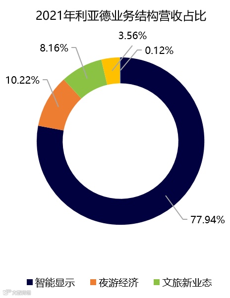 业务板块:公司营业收入按照业务结构可以分为智能显示68.99亿、夜游经济9.05亿、文旅新业态7.22亿、VR体验3.15亿以及其他业务、其中主要业务智能显示同比增长33.02%;