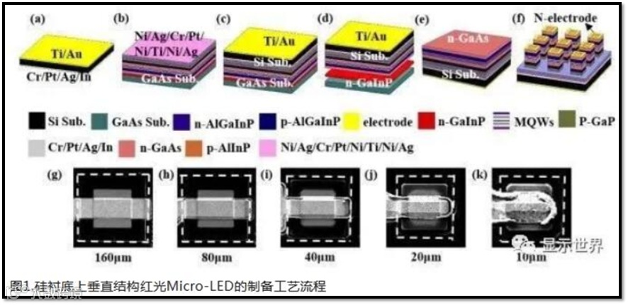 中科院长春光学精密机械与梁静秋研究员团队:使用晶圆键合和衬底转移技术,制备五种像素尺寸(最小尺寸为10μm)的硅衬底AlGaInP红光Micro-LED以探究其尺寸效应,研究采用低损伤刻蚀技术减小LED芯片侧壁缺陷;采用散热性能更好的硅衬底代替GaAs衬底,改善LED芯片的散热性,且避免GaAs衬底对红光的吸收;