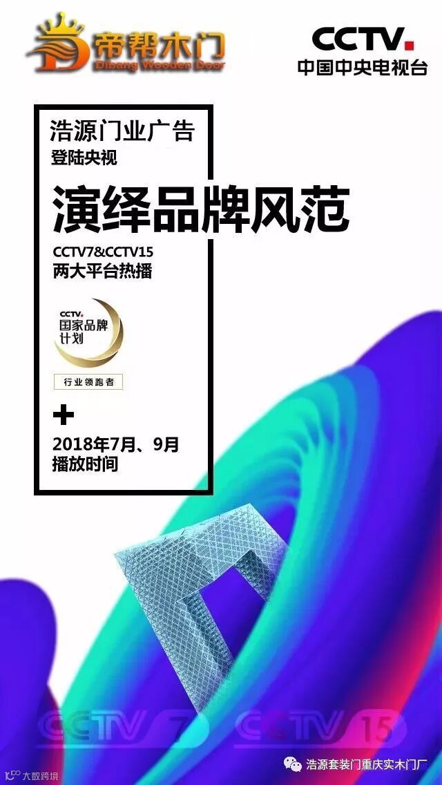 目前,帝帮木门正式与央视达成合作关系,敲定帝帮木门品牌广告于七月、九月正式登陆CCTV7 和 CCTV15两大平台热播,一展帝帮品质!