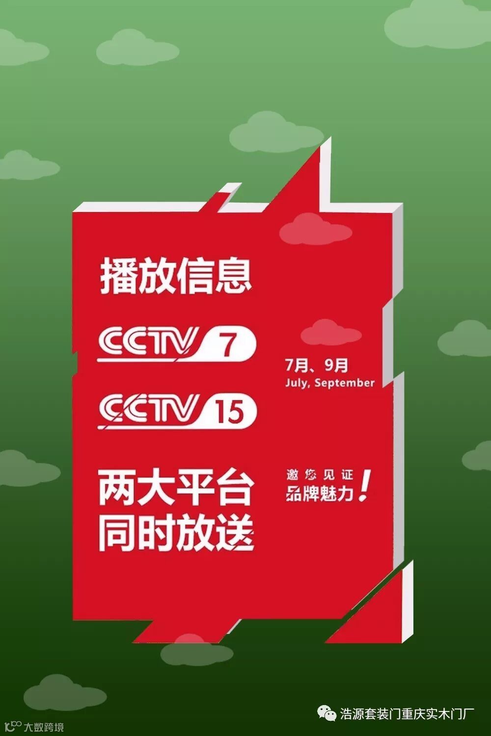 七月已至,帝帮木门也将开启在央视展播。与央视合作,有央视两大平台的轮播放送,将很好的为帝帮木门做广告宣传,为帝帮木门布局全国各地市场添砖加瓦。