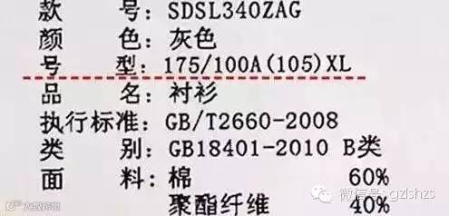 号型中没有标明身高和胸围的衣服是不合格的。合格衣服的号型标注:“175/100A”,175表示身高、100表示胸围、A表示体型。A表示“正常”、B表示“偏胖”、C表示“胖”、Y表示“偏瘦”。