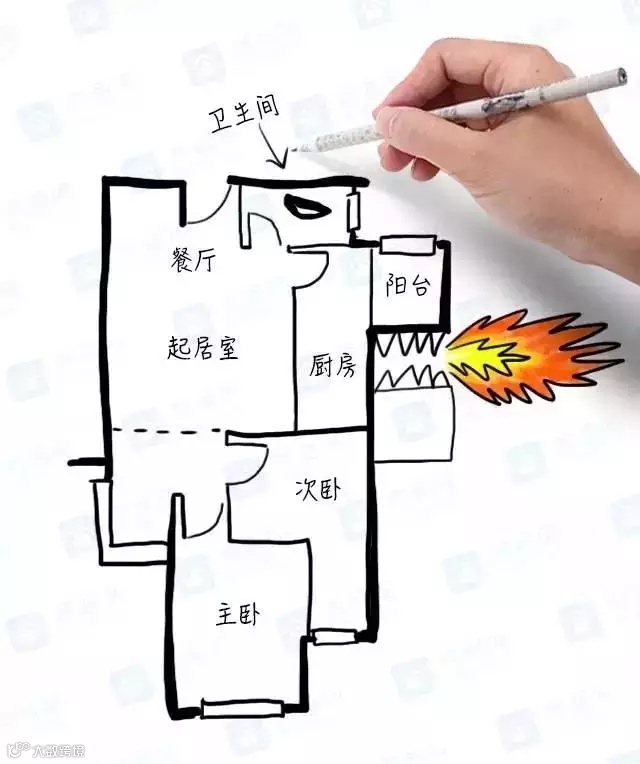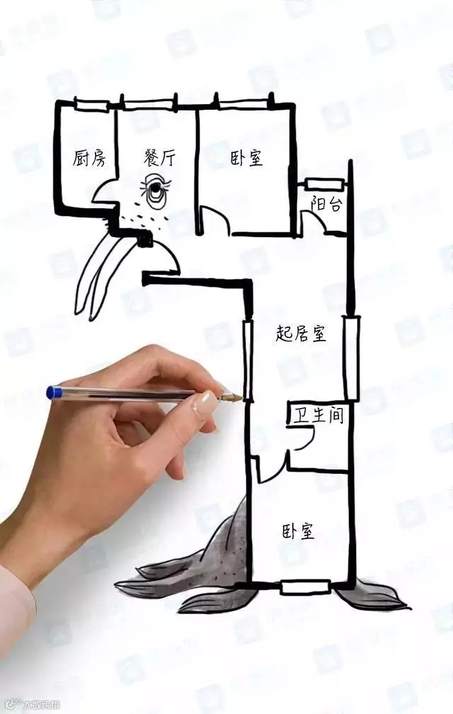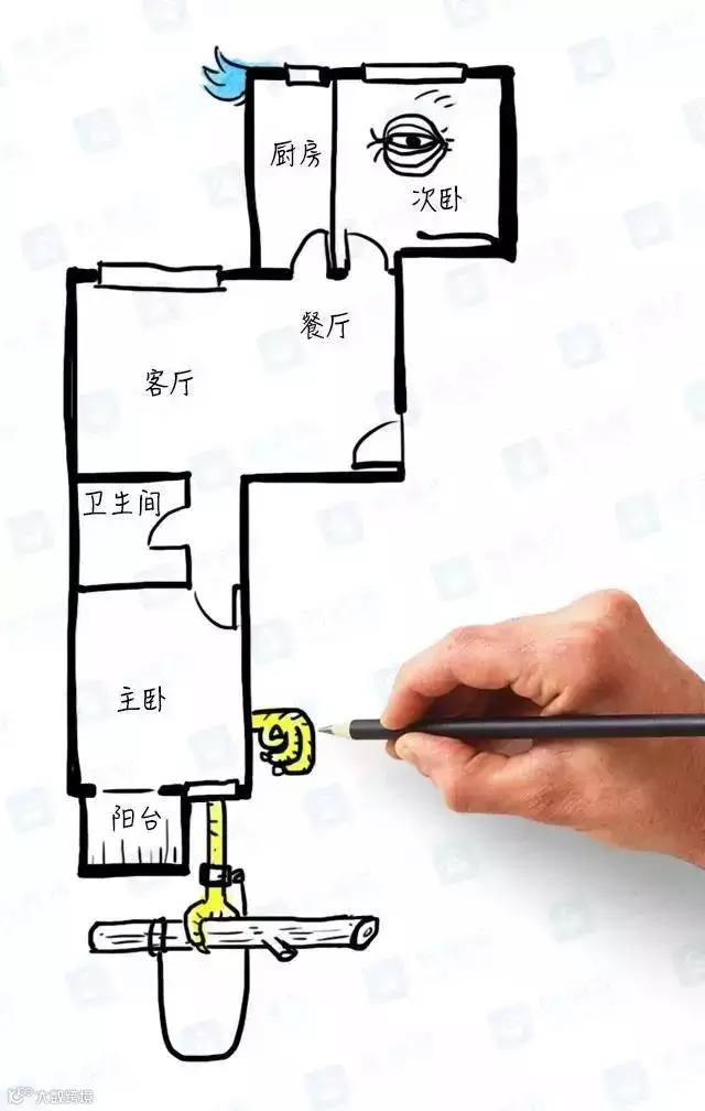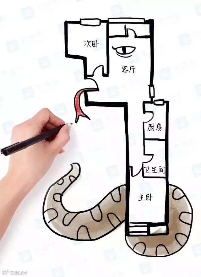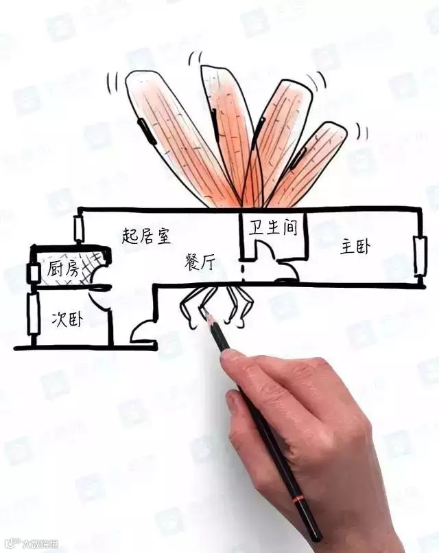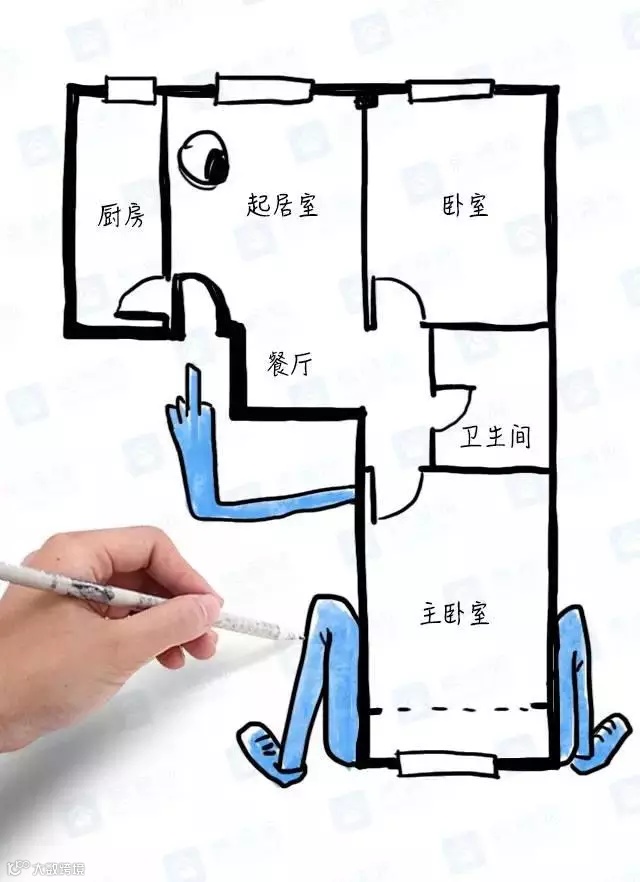 ▲典型的手枪户型,风水不好。动线交叉,行动不便,客厅被各种门和通道连接,电视放在哪里也很难定夺。