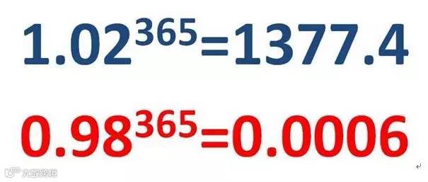 1.01=1+0.01,也就是每天进步一点。1.01的365次方也就是说你每天进步一点点,一年以后,你将进步很大,远远大于“1”