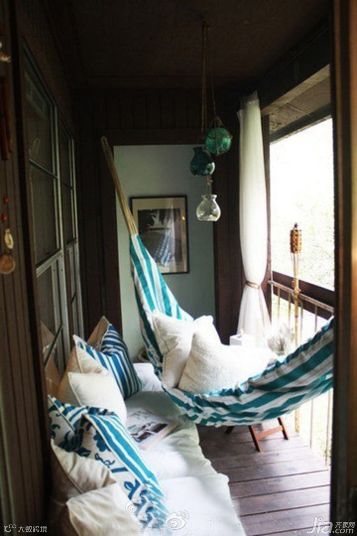 在阳台上挂上一张吊床,不管周末是暖洋洋还是阴雨绵绵,荡悠在自家的阳台上,听自然的声音。