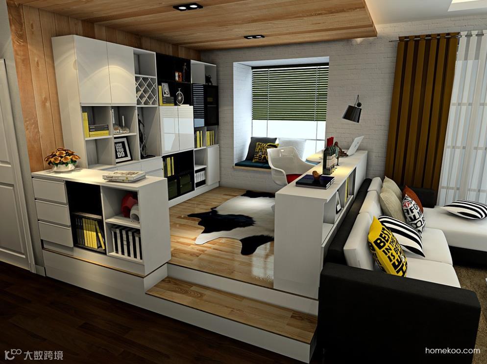 沙发后空间通过制造一个地台,进行空间的区分。并在地台外围定制了两层的格子柜,让开放空间有了一定的私密度。
