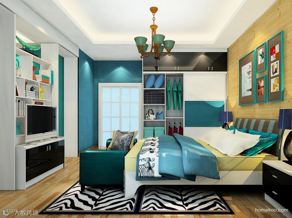 卧房的中间顶上有一条横梁,这恰好成为空间隔断的天然好帮手。在中部定制一个镂空的展示架,既可存放展示品,又可增加隔断性。