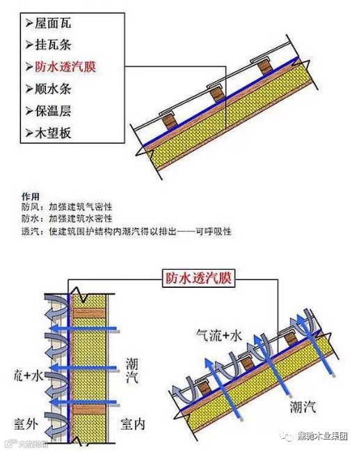 木结构房屋的屋顶和墙体都会铺装防水透气膜,让墙体内部因所处环境湿度生成的水汽顺利的排出墙体外,让外部水汽通过防水透气膜时拒绝入内,但是空气可以通过防水透气膜能够在墙体内外流动,形成良性循环,让木结构房屋墙体内部保持干燥环境,防止潮湿,使木结构房屋使用寿命延长,形成只出不进安全屏障。