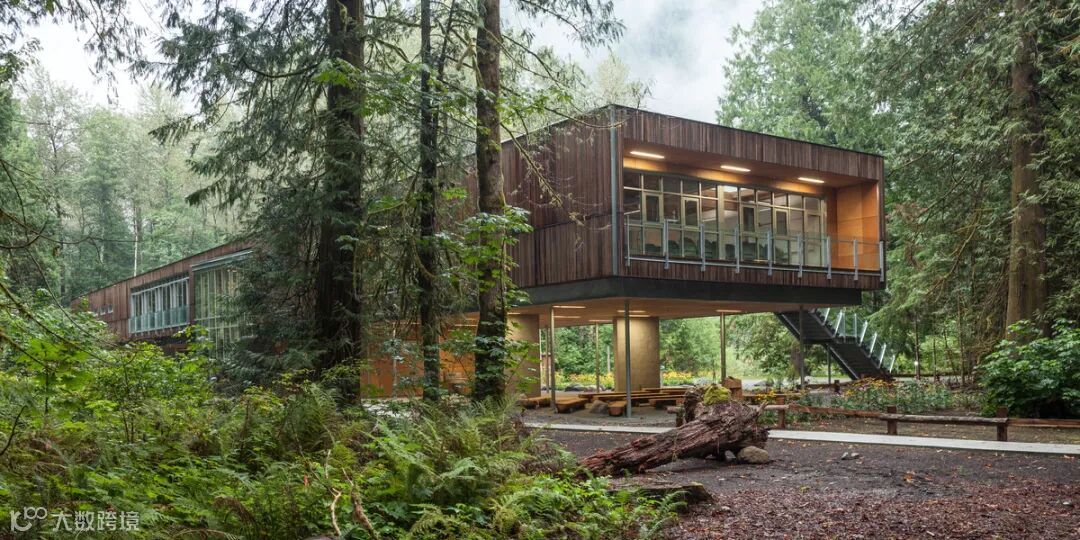 该建筑由教室和展览空间组成,位于Cheakamus河泛滥平原上方,坐落在固定在混凝土板上的钢柱上。