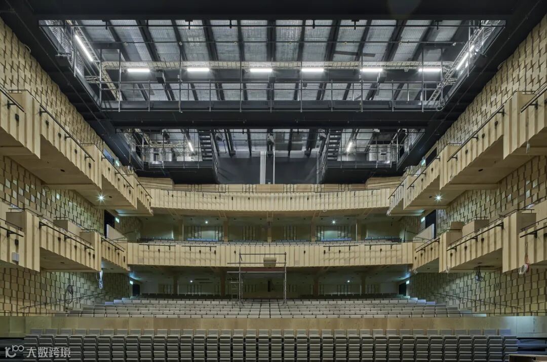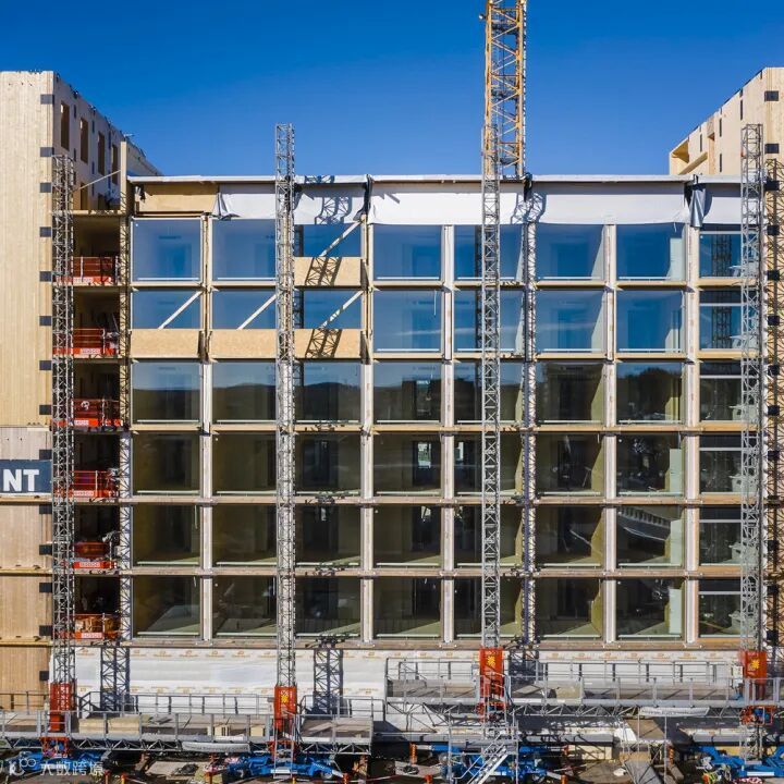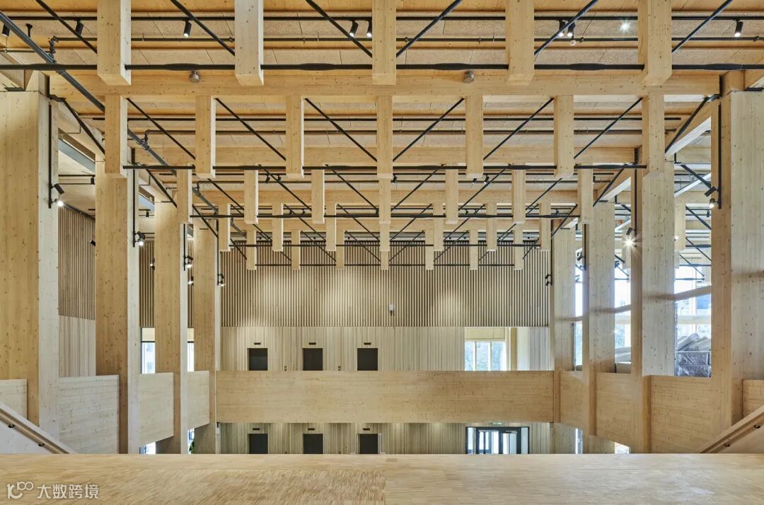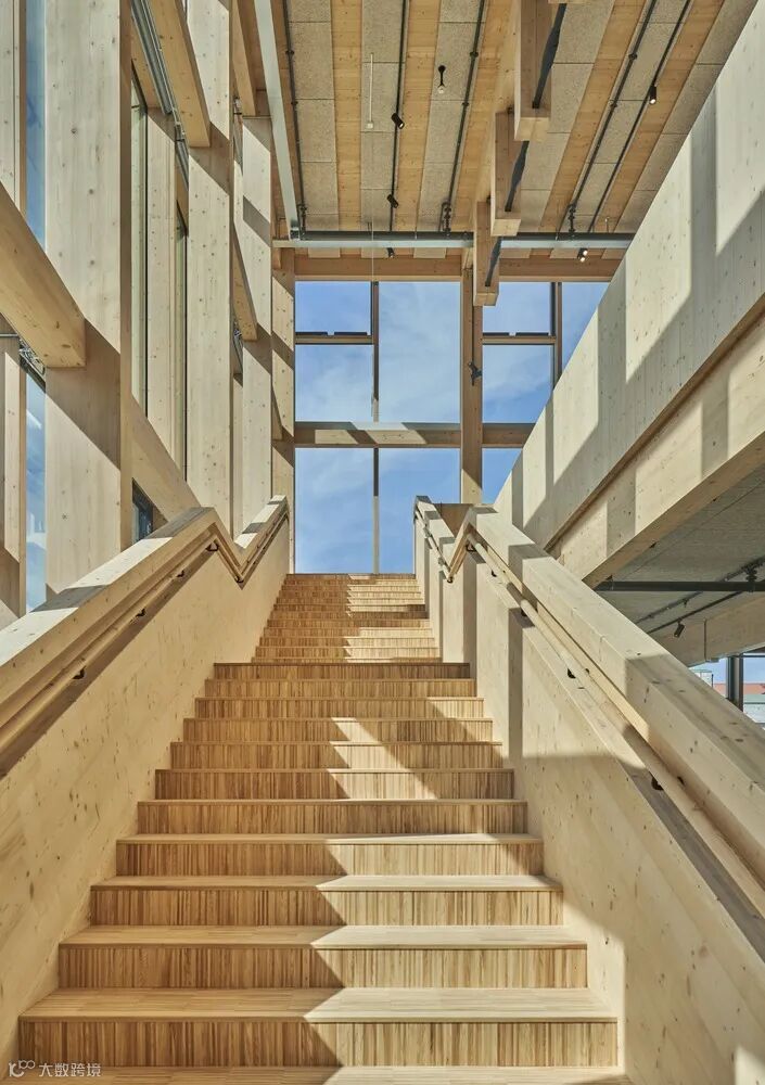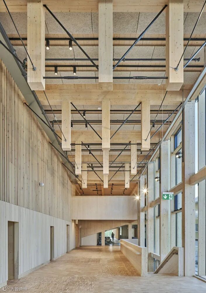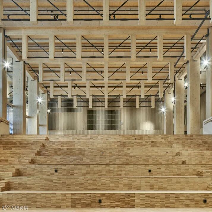 这座建筑功能很多,里面有艺术画廊、博物馆、图书馆、剧院和 205 间客房的酒店,各功能区通过木结构连在一起。建筑里的木制楼梯,不仅能走人,还能当舞台或开会用。CLT 电梯井和玻璃幕墙,让人在里面就能看到木结构。