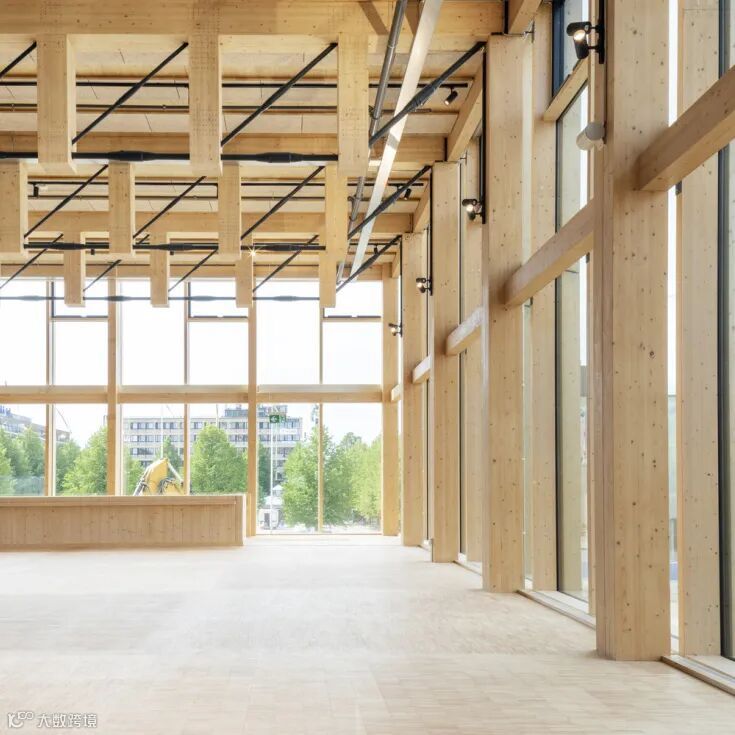 在可持续发展方面,Sara Kulturhus 中心做得很好。木结构用的木材可再生、碳中性,建筑结构能储存 9000 吨二氧化碳,是施工排放的两倍,实现碳负排放。能源供应全靠可再生能源,一部分来自地热热泵,一部分靠 1200 平方米的屋顶太阳能电池板。木材露天部分做了阻燃处理,兼顾安全和环保。