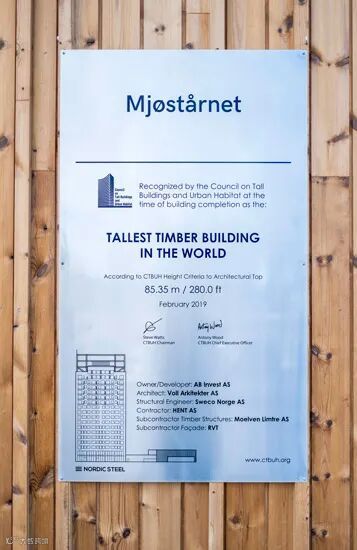 Mjøstårnet 高达 85.4 米(约 280 英尺),于 2019 年 5 月被确认为世界上最高的全木结构建筑。这一荣誉的获得,标志着木结构建筑在高层建筑领域的重大突破。2019 年 5 月 7 日,世界高层都市建筑协会(CTBUH)的代表们齐聚此地,为其举行了官方的揭牌仪式,“世界最高木建筑” 的招牌正式亮相。