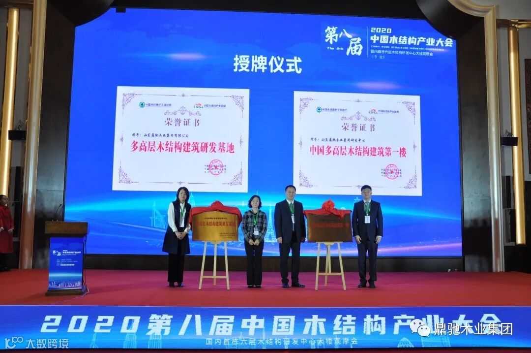 与会期间授予山东鼎驰木业集团有限公司董事长许文浩先生为山东分会轮值会长,授予山东鼎驰木业集团有限公司《多高层木结构建筑研发基地》、《中国多高层木结构建筑第一楼》、《中国木结构产业领军品牌》、2020中国木结构优质工程银奖荣誉。