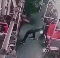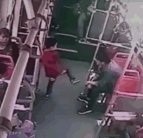 几个月前,在一辆公交车上,一个小男孩反复用脚踢旁边坐着的男乘客。