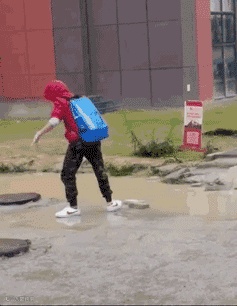 暴雨过后,一个背书包的男孩,在一段满是积水的路上停了下来。
