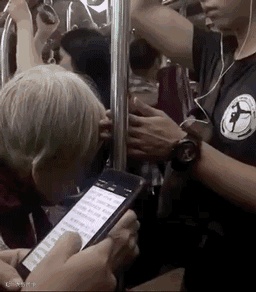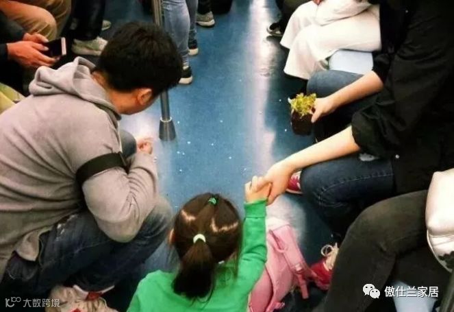 同样是地铁上,一个男孩怕老奶奶碰到头,一直小心的用手挡着。