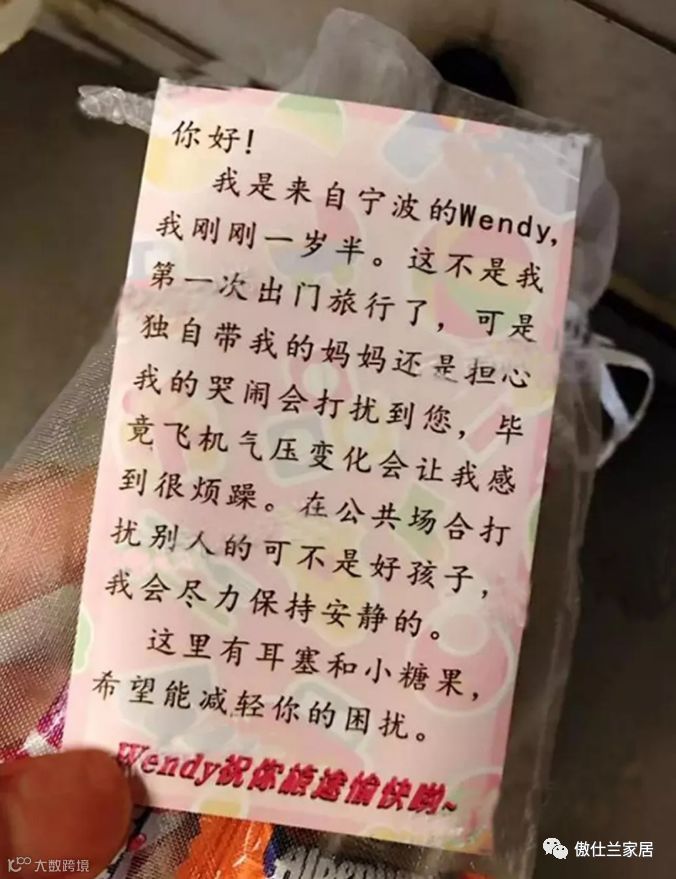 “我刚刚一岁半……独自带我的妈妈担心我的哭闹会打扰到您,这里有耳塞和小糖果,希望能减轻你的困扰……”